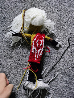 I used the same technique for the feet as I did with the Janos doll, but used a sort of off-white acrylic yarn to give it a sort of ivory colour. This was also to try to make a clear distinction between the claws and the hair.
